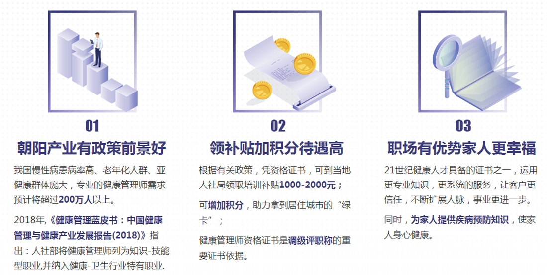健康管理师是从事个体和群体从营养和心理两方面健康的检测、分析、评估以及健康咨询、指导和危险因素干预等工作的专业人员。为了适应全面建设小康社会的需要,提高全民族的健康意识和身体素质,培养和造就健康管理人才,人力资源和社会保障部及电化教育馆等教育培训中心推出健康管理师岗位能力培训课程。